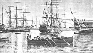 A scene from "Mutiny on the Bounty" showing former cargo carriers rebuilt as eighteenth-century vessels.