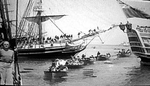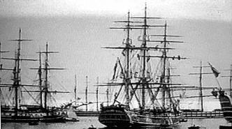 There seem to be many other replica vessels in the "Portsmouth" scenes. Flags are flying on them and people can be seen moving about on their decks. The scene appears to have been shot at Long Beach.