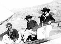 Sea Scouts J. Albright, S. Boyd, E.E. Lord from S.S.S. Viking of Long Beach, CA at Isthmus Catalina Island while filming Mutiny on the Bounty (June 1935) - this launch is seen in the Portsmouth Harbour sceneMarine Artist Arthur Beaumont painted backdrops for the film set.