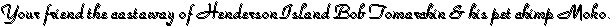 Tomarchin and Moko on Henderson Island Tom Christian wrote: The photo is definitely Robert Tomarchin on the beach at Henderson. Photo courtesy of Dr. Herbert Ford , of the Pitcairn Islands Study Center at Pacific Union College. This photo was supplied by Ron Edwards of Hallam, Victoria, Australia who found it during a routine clean up at the Courthouse at Pitcairn in 1980/1. Thank you Ron for contacting the Henderson Island Website, and donating the photo to Dr. Ford's collection!