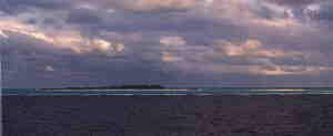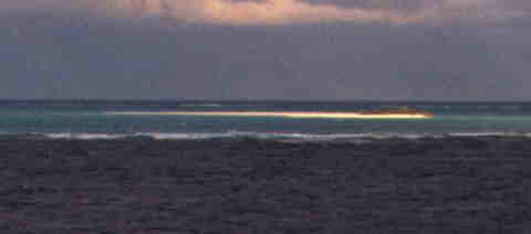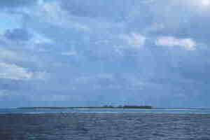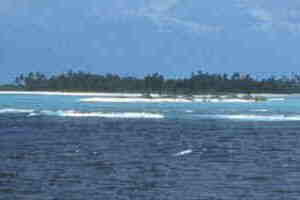 Oeno island is surrounded by a lagoon that is formed by the coral ring surrounding the island at quite a distance. The edge of the coral reef can be seen by the transition from light blue/green water to the darker ocean water. The deck height of the ship,however, does not make for a good viewing